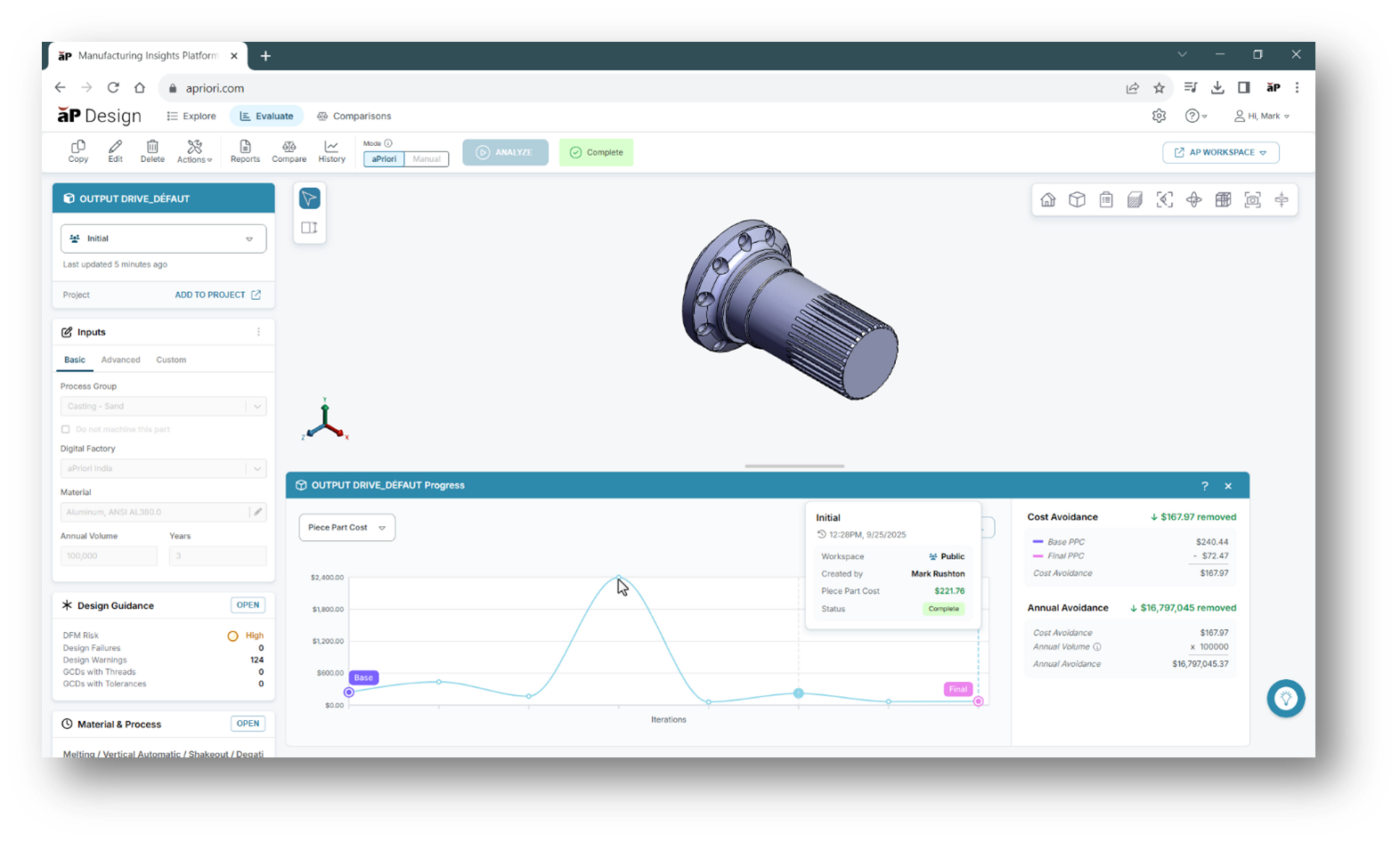 aPriori changes that dynamic. Its embedded intelligence delivers the insights of experienced cost and manufacturing experts directly into the hands of every designer. Models are automatically evaluated against real-world production data, identifying risks and opportunities at the earliest stages of development.