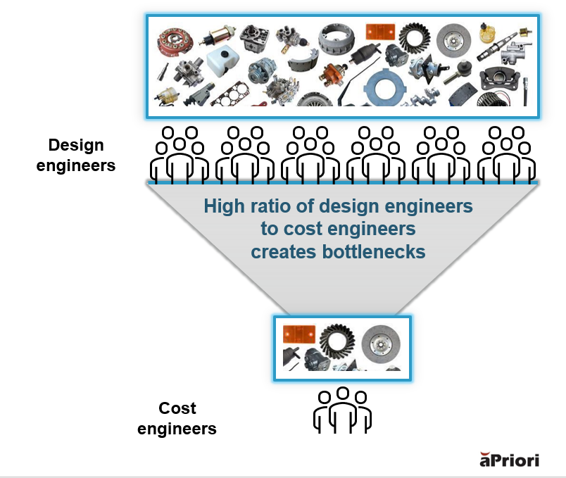 Traditionally, the largest bottleneck is between design engineering and cost engineering. Relying on one department, cost engineering, to capture cost savings isn’t optimal or scalable – especially when manufacturers have a 25:1 ratio of designers to cost engineers (or more).