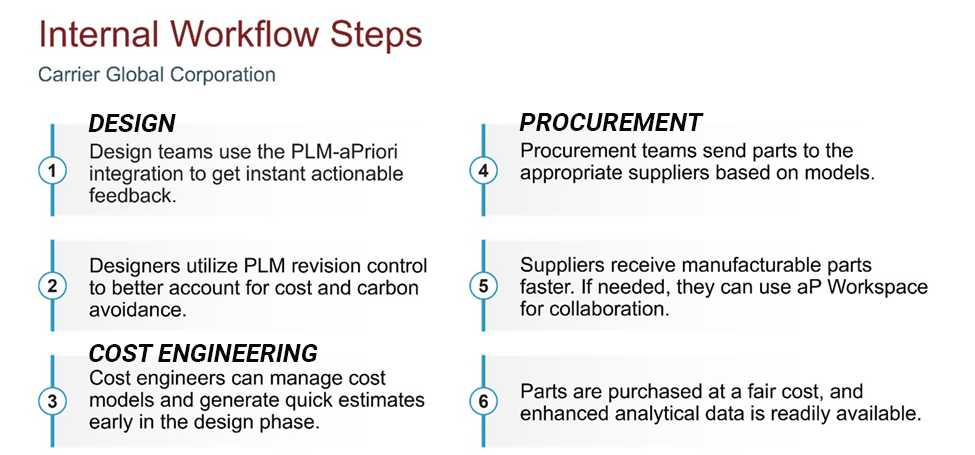 Figure 3: Internal workflow steps are achieved using digital factories. Leveraging aPriori for digital factories, Carrier was able to obtain accurate cost models on complex products in a matter of minutes at all stages of product development. aPriori enables manufacturers to identify and eliminate cost creep at its source—during design—continuously updating costs as the design changes. By embedding digital manufacturing intelligence directly into engineering workflows, aPriori gives teams early and continuous visibility into the cost impact of their decisions. Engineers can evaluate materials, processes, tolerances, and manufacturing strategies in real time. Sourcing teams gain insight before supplier engagement. Manufacturing teams see risks before designs are finalized. Everyone works from a shared, data-driven view of cost as well as a unified narrative, complete with the right cost language. Instead of reacting to cost overruns late in the lifecycle, manufacturers using aPriori prevent them altogether and streamline product development in the process. Figure 4: Cost creep can be avoided and margins enhanced across all stages of product development with cost intelligence. Product cost creep is not inevitable. It is a symptom of late visibility and disconnected decision-making. By shifting cost insight left and aligning teams early, manufacturers can protect margins, reduce risk, and deliver products that meet both performance and cost targets—from concept through production. Shifting left only works if teams get instant, continuously updating cost feedback from CAD, directly inside existing workflows—creating a shared, automated cost language across functions and product development teams (engineering, sourcing, manufacturing). aPriori is more than an analytics tool. It provides an infrastructure for scalable design to cost. Manufacturers committed to optimizing and accelerating product development, ensuring profitability, and remaining agile and competitive need a solution like aPriori. By reducing product cost creep, a manufacturer can improve its value proposition. As a result, it can be more competitive on price, scale faster and more efficiently, leverage data for greater transparency and predictability, and provide a higher-quality product with less risk.