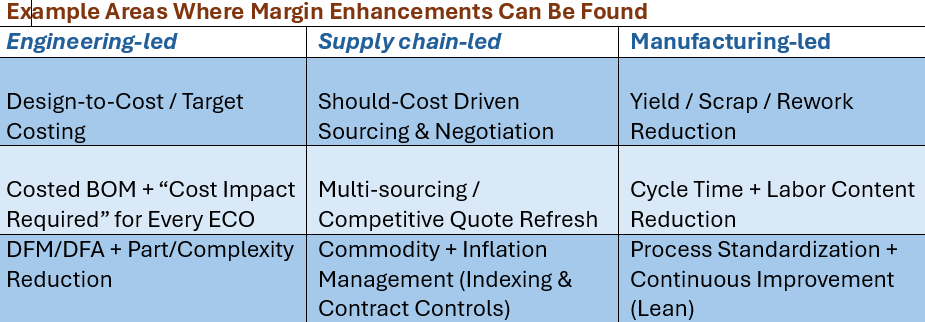 Most corporate margin expansion programs are not about strategic growth—they are reactive recovery efforts. They exist for three main reasons: (1) products were launched with structural cost disadvantages, (2) engineering decisions were committed too early, and (3) fixes were deferred until after the start of production. As a result, companies must look for margin enhancements in other areas, including: